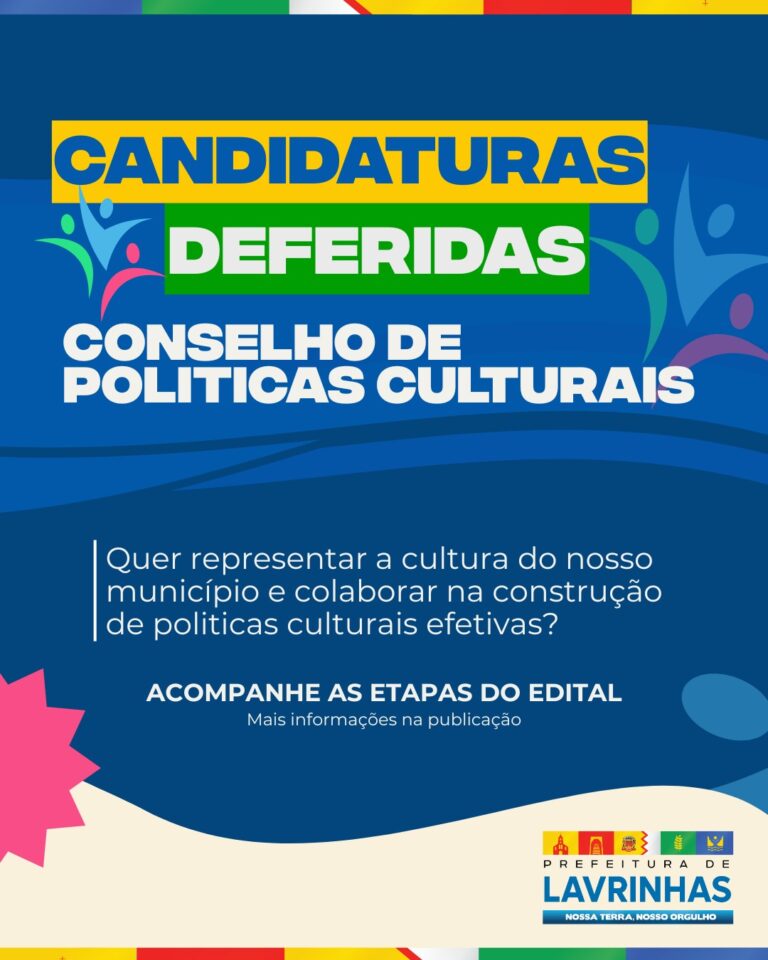 A Secretaria Municipal de Turismo e Cultura de Lavrinhas, em conformidade com o disposto no Edital de Chamamento Público para a Eleição do Conselho Municipal de Política Cultural – CMPC (Gestão